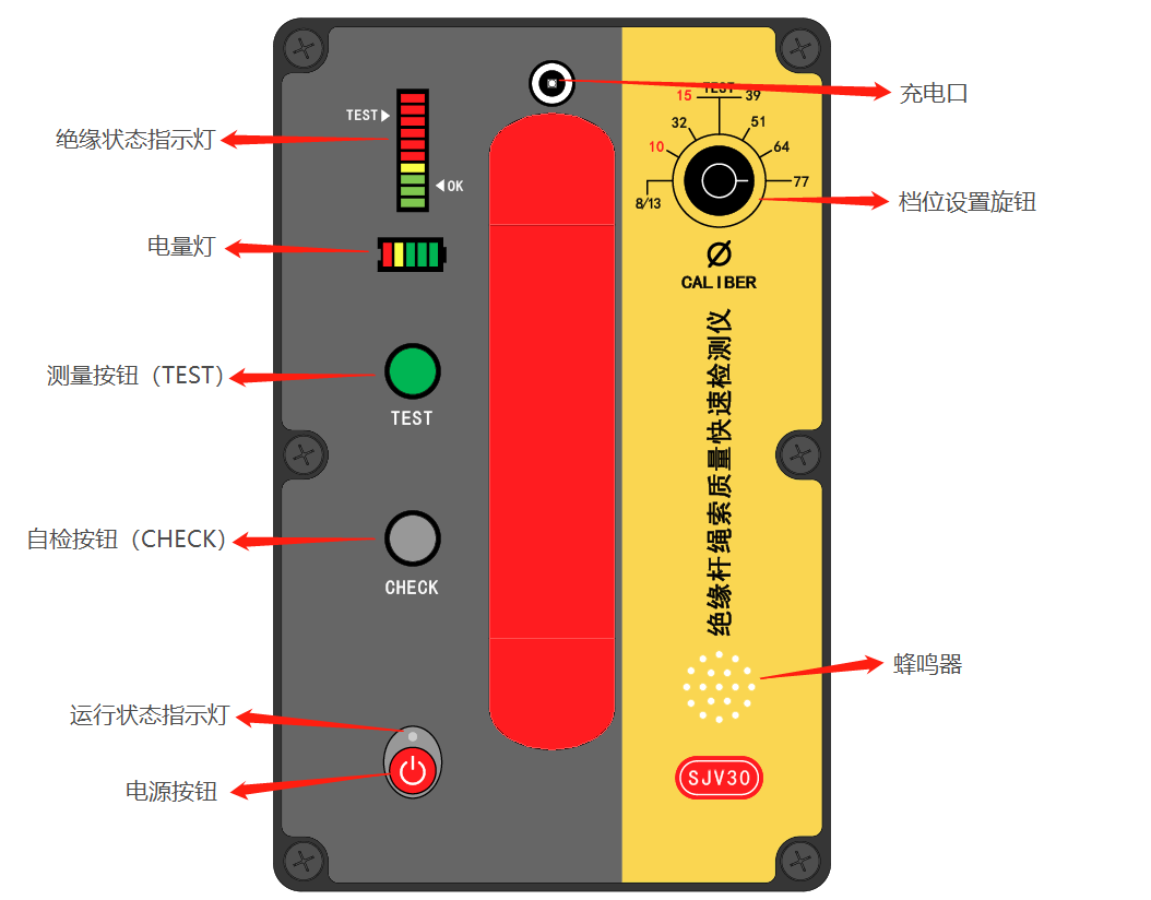 電源按鈕”、“運行指示燈”、“測試按鈕(TEST”、“自檢按鈕(CHECK”、“檔位設置旋鈕”、“充電口”、“絕緣狀態(tài)指示燈”、“電池電量指示燈”。