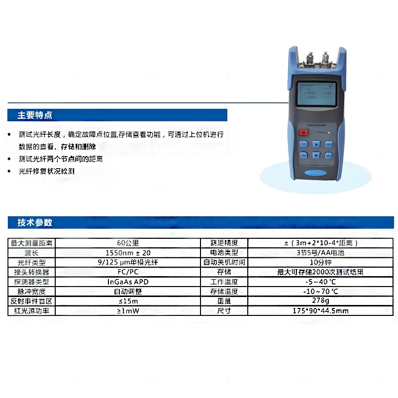 ①:最大探測(cè)距離60km是指,在動(dòng)態(tài)范圍內(nèi)60km處可探測(cè)到>1dB的反射事件;非反射事件的探測(cè)距離為40km(>1dB)。