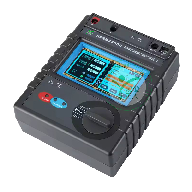 KDZD3800A 手持式防雷元器件測試儀用于測量各種壓敏電阻(MOV)和氣體放電管(GDT) 性能參數(shù)測試,儀表具有高壓短路保護(hù)、過流保護(hù)功能,具有參數(shù)設(shè)置功能、高壓 限值設(shè)定、升壓速度設(shè)定、合格范圍設(shè)定、合格判斷篩選、自動量程調(diào)節(jié)等功能。還具有單件測試模式、連續(xù)測試模式功能,適合批量元件測試。其中KDZD3800A還具有絕緣電阻、吸收比、極化指數(shù)測試功能。