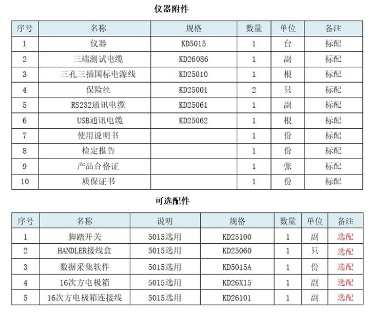 10、隨機附件:使用說明書、測試報告、質保證書、保修卡、裝箱單、儀器、電源線、保險絲、三端開爾文測試夾、RS232通訊電纜、USB通訊、電纜腳踏開關(選配))