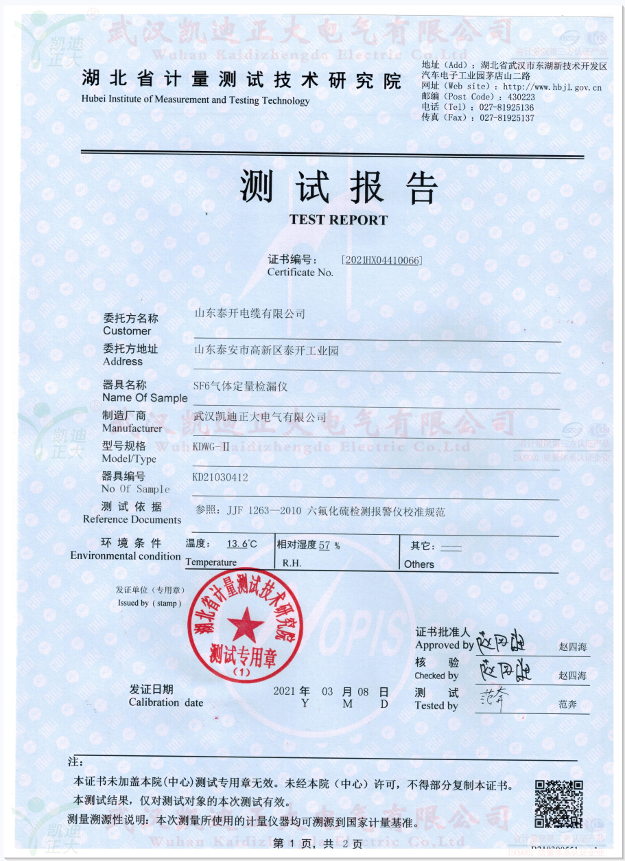 泰開電纜從事輸變電設備制造、低壓電器、專用汽車等多種行業的大型企業集團。在輸變電行業具備了研發、生產與銷售550千伏及以下電壓等級輸配電設備總成套供貨、電站工程項目總承包建設的能力。需要六氟化硫的檢測設備,這次采購的KDWG-II型SF6氣體定量檢漏儀用于設備的SF6氣體檢漏,我們為其推薦了KDQH-12Y-54-150L氣體回收凈化裝置、KDQC-33氣體抽真空充氣裝置等設備。采購的設備須有湖北省計量院的測試報告,這次獲得計量院測試報告。