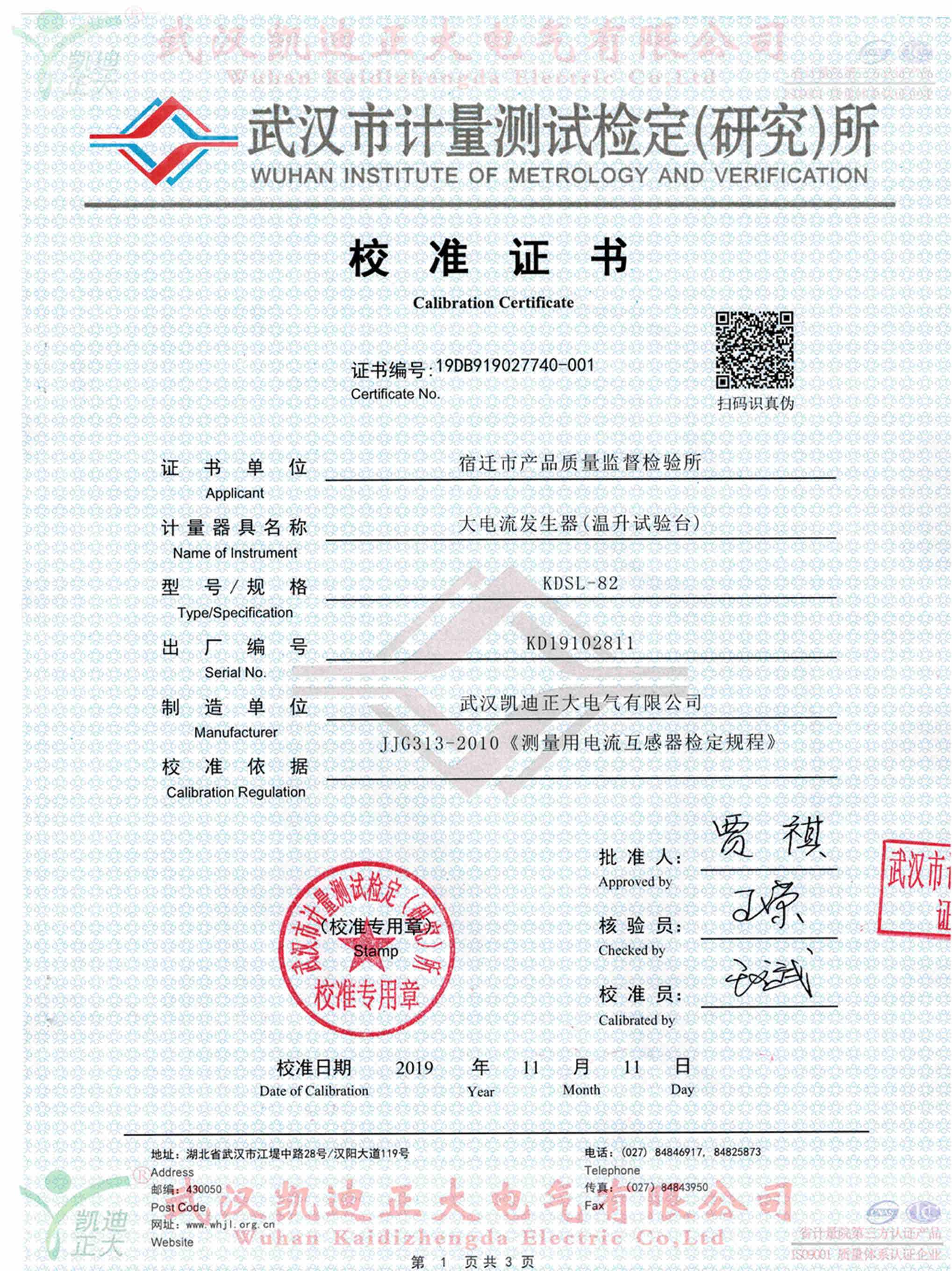 武漢市計量測試檢定(研究)所對宿遷市產品質量監督檢驗所采購的產品作檢定效驗報告。