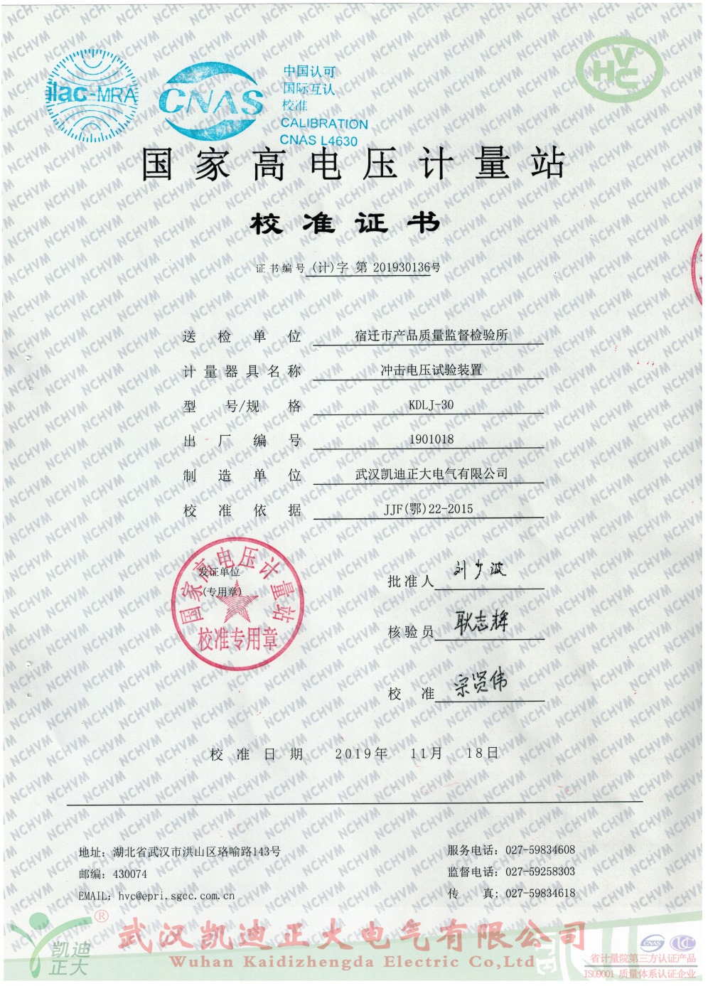 我司以最高分獲得評標方的認可,中標低壓成套開關設備檢測:KDHL-100A接觸電阻測試儀、KD305絕緣電阻測試儀、KDLJ-30kV沖擊電壓試驗裝置、KDWS-82大電流溫升試驗臺、KDYDJ工頻耐壓試驗裝置(3kvA50kV)、KDGK-F機械特性綜合測試儀。同時,我司設備獲得武漢市計量檢測研究院檢定、校準合格。KDLJ-30kV沖擊電壓試驗裝置獲得國家高電壓計量站校準證書:證書編號(計)字第201930136號,送檢單位:宿遷市產品質量監督檢驗所。校準依據:JJF(鄂)22-2015.