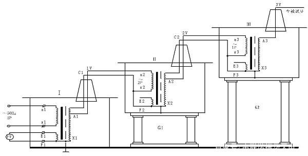 三臺試驗變壓器串級使用,例如上述型號分別是10kVA/50kV、5kVA/50kV、3kVA/50kV,那么三臺容量之比就是3:2:1,總容量同樣也是第一級試驗變壓器容量10kVA,而總電壓就是三臺試驗變壓器的電壓之和,也就是說總電壓輸出為150kV。