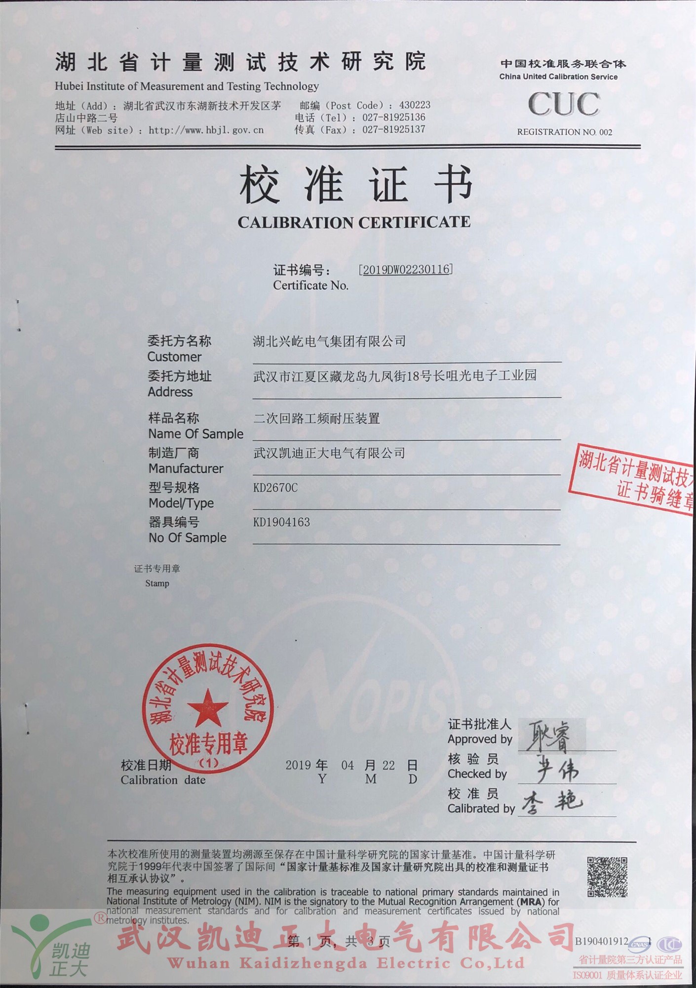 購買后便送往中國校準(zhǔn)服務(wù)聯(lián)合體-湖北省計(jì)量測試技術(shù)研究院檢定,由省計(jì)量院出具的《校準(zhǔn)證書》,證書編號:2019DW02230116,校準(zhǔn)員:李艷,檢驗(yàn)員:嚴(yán)偉,證書批準(zhǔn)人:耿睿。