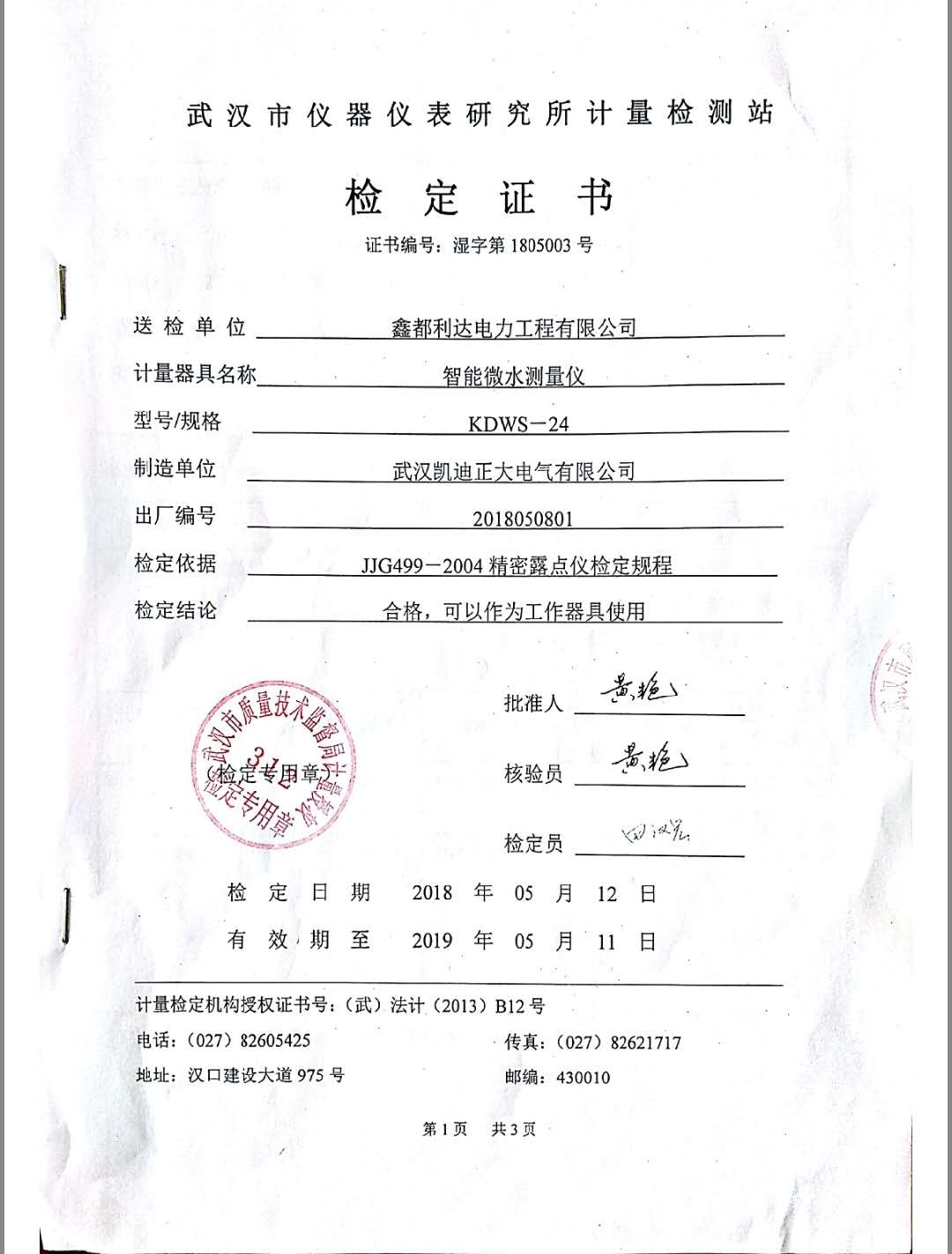 武漢市儀器儀表研究所計(jì)量檢測(cè)站,計(jì)量檢定機(jī)構(gòu)授權(quán)證書(shū):(武)法計(jì)(2013)B12號(hào)。武漢凱迪正大電氣有限公司生產(chǎn)的KDWS-24智能微水測(cè)量?jī)x,出廠(chǎng)編號(hào)2018050801,符合檢定依據(jù)JJG499-2004精密露點(diǎn)儀檢定規(guī)程,可以作為工作器具使用。獲得武漢市儀表研究院計(jì)量站檢定證書(shū),證書(shū)編號(hào):濕字第1805003號(hào)。