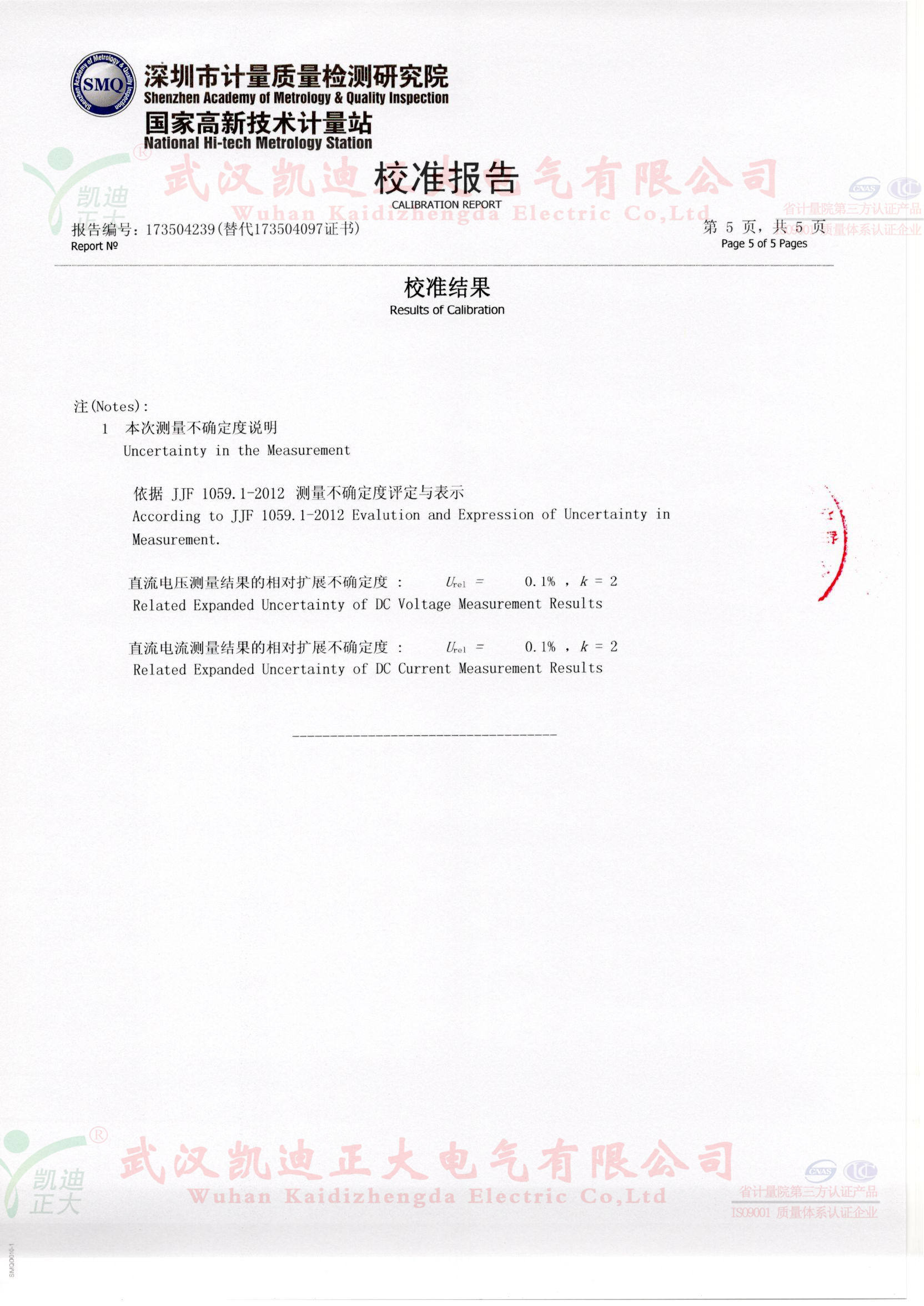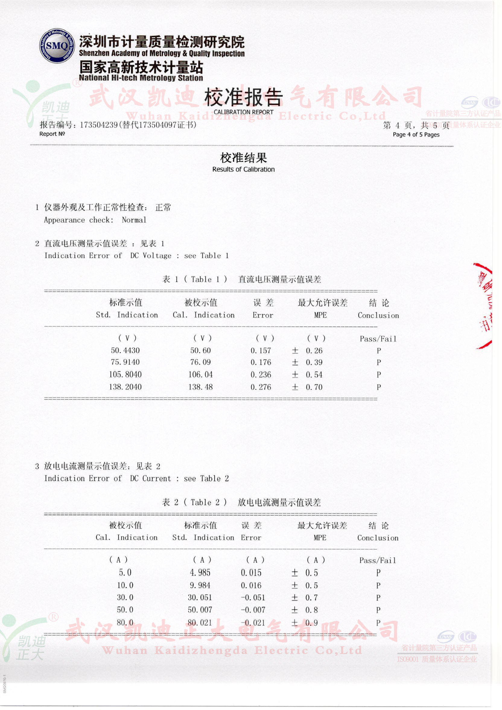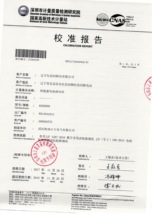 應中廣核遼寧紅沿河核電有限公司的需求,將武漢凱迪正大電氣公司生產的KDZD880(110V80A)智能蓄電池放電儀出具國家高新技術研究院的計量報告后才能使用。校準報告:173504097證書號,出廠編號:KD14122815,資產編號:500077905,校準依據:參考JJF158-2016數字多用表校準規范JJF(軍工)108-2015電池充放電測試儀校準規范。嚴格出具檢定合格報告。