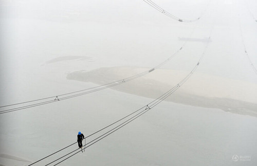3月16日,國網湖北電力檢修公司鄂西北運維分部的檢修工在漢江大跨越走線檢查間隔棒的運行情況。新華社記者郝同前攝