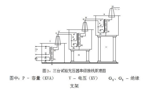 2、三臺高壓試驗變壓器串級獲得更高電壓的結(jié)線原理見圖3。