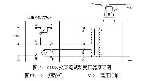 1、高壓試驗變壓器的工作原理圖見圖1、圖2。 圖2中高壓套管中裝有高壓硅堆,串接在高壓回路中作半波整流,以獲得直流高電壓。當(dāng)用一短路桿將高壓硅堆短接時,可獲得工頻高電壓,作為交流輸出狀態(tài);取消短路桿時,作為直流輸出狀態(tài)。