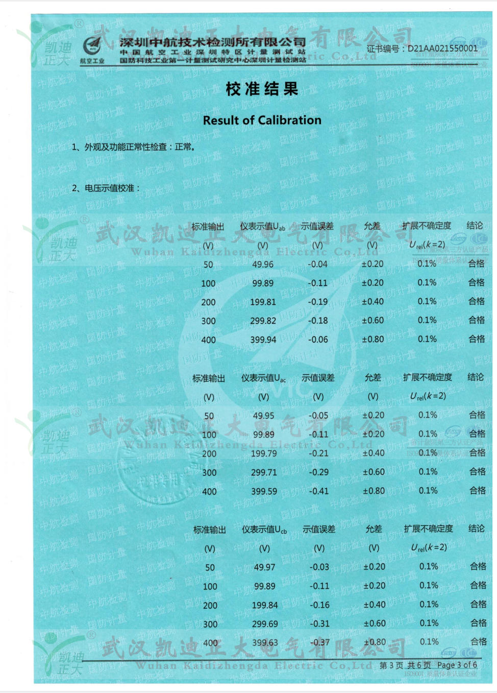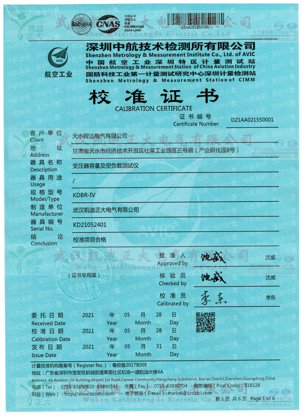 KDBR-IV變壓器容量及特性測試儀是我司老客戶天水程達電氣再次采購的,因多次為質檢所等相關單位提供高低壓成套檢測設備,所以程達電氣對我司產(chǎn)品青睞。應要求需要出具中國合格評定國家認可委員會(CNAS)相關單位的電壓示值校準、電流示值校準、功率示值校準等數(shù)據(jù)。深圳中航技術檢測大多數(shù)限公司(中國航空工業(yè)深圳特區(qū)計量測試站/國防科技工業(yè)第一計量測試研究中心深圳計量檢測站 )是航空工業(yè)北京長城計量測試技術研究所、國防科技工業(yè)第一計量測試研究中心于1986年投資建立的計量技術檢測服務機構,是深圳市最早的法定計量檢測機構之一,是具有法定計量、國防計量、軍用計量屬性的第三方公正實驗室。