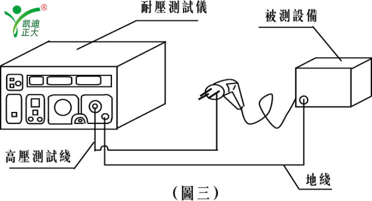 按圖三將耐壓儀與被測整機連接,接通被測整機電源開關(guān),根據(jù)被測整機產(chǎn)品標準設置漏電流報警值,然后再按4條或5條所進行測試。如若被測整機產(chǎn)品標準沒有規(guī)定具體漏電流報警值,則推薦按下式計算:Iz=Kp(U/R)...............(1)