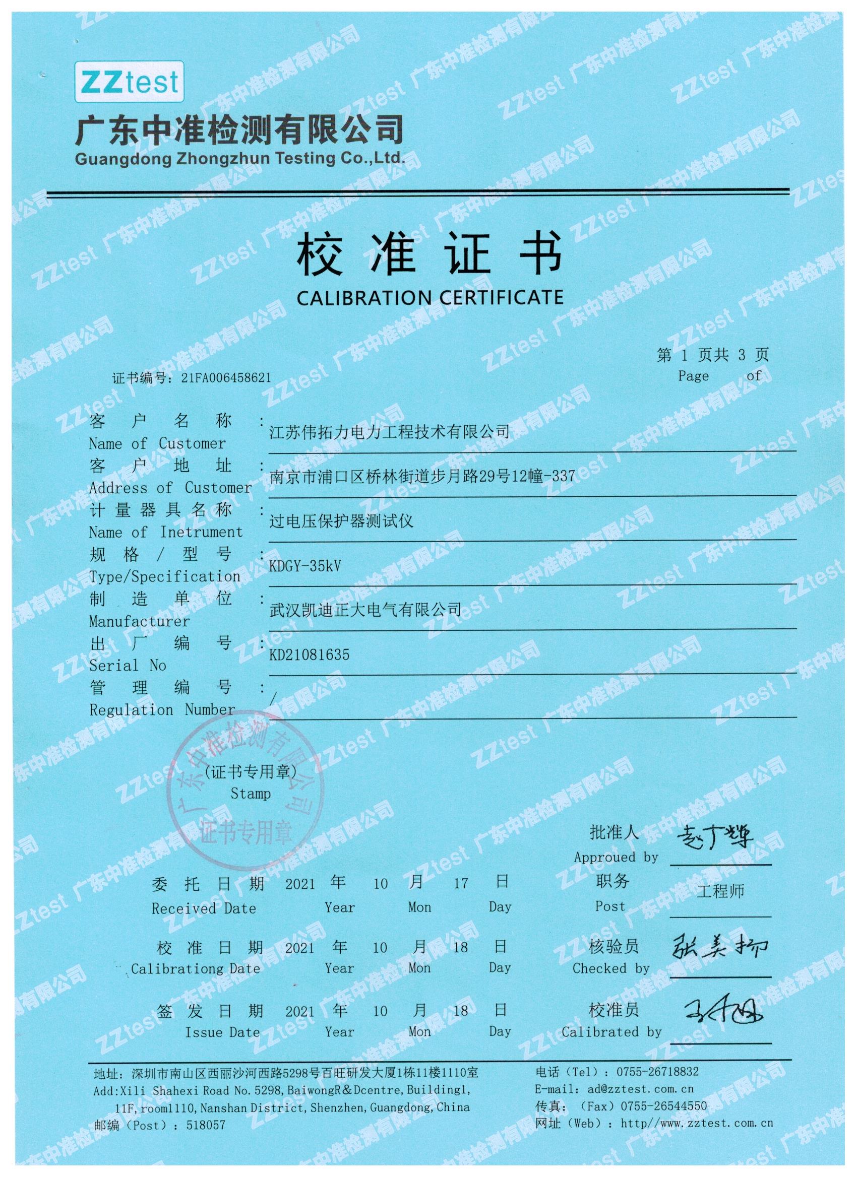 我們一直嚴把質量關,下面就是我們與江蘇偉拓力合作的過電壓保護器測試儀設備送檢結果