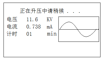按退出鍵顯示20組歷史數據,將光標移到“啟動試驗電壓”按確定鍵,儀器進入圖6所示的升壓界面。