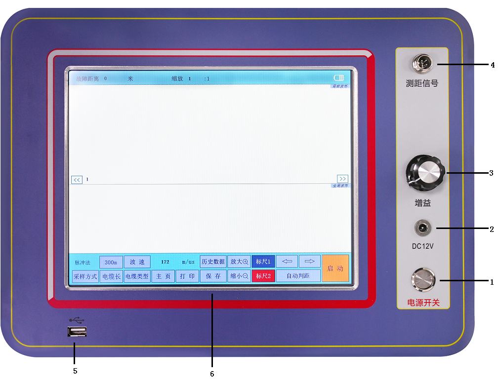 4、測距端口:測量電纜故障點(diǎn)距離時,從該端口發(fā)出信號。