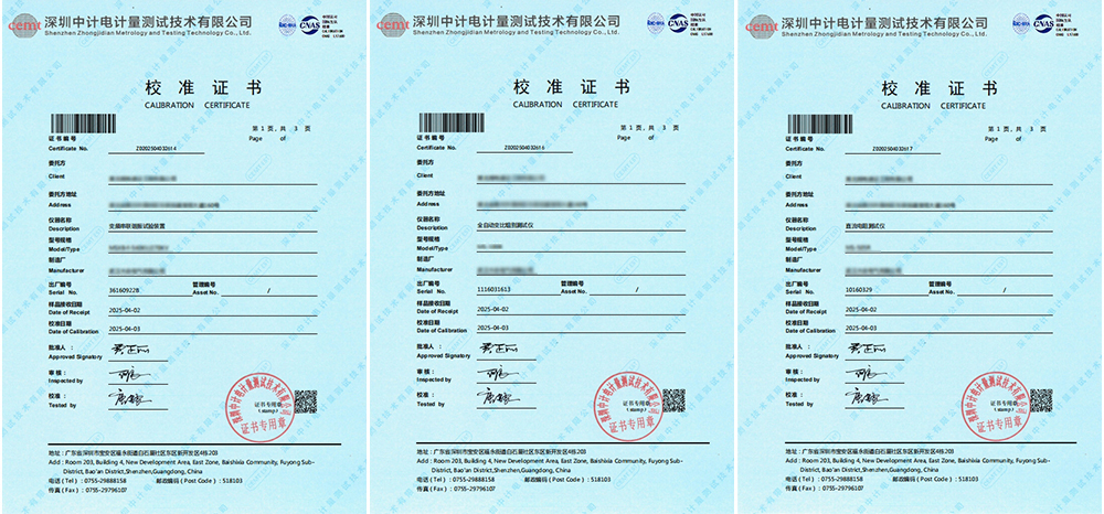 部分校準(zhǔn)證書如下: