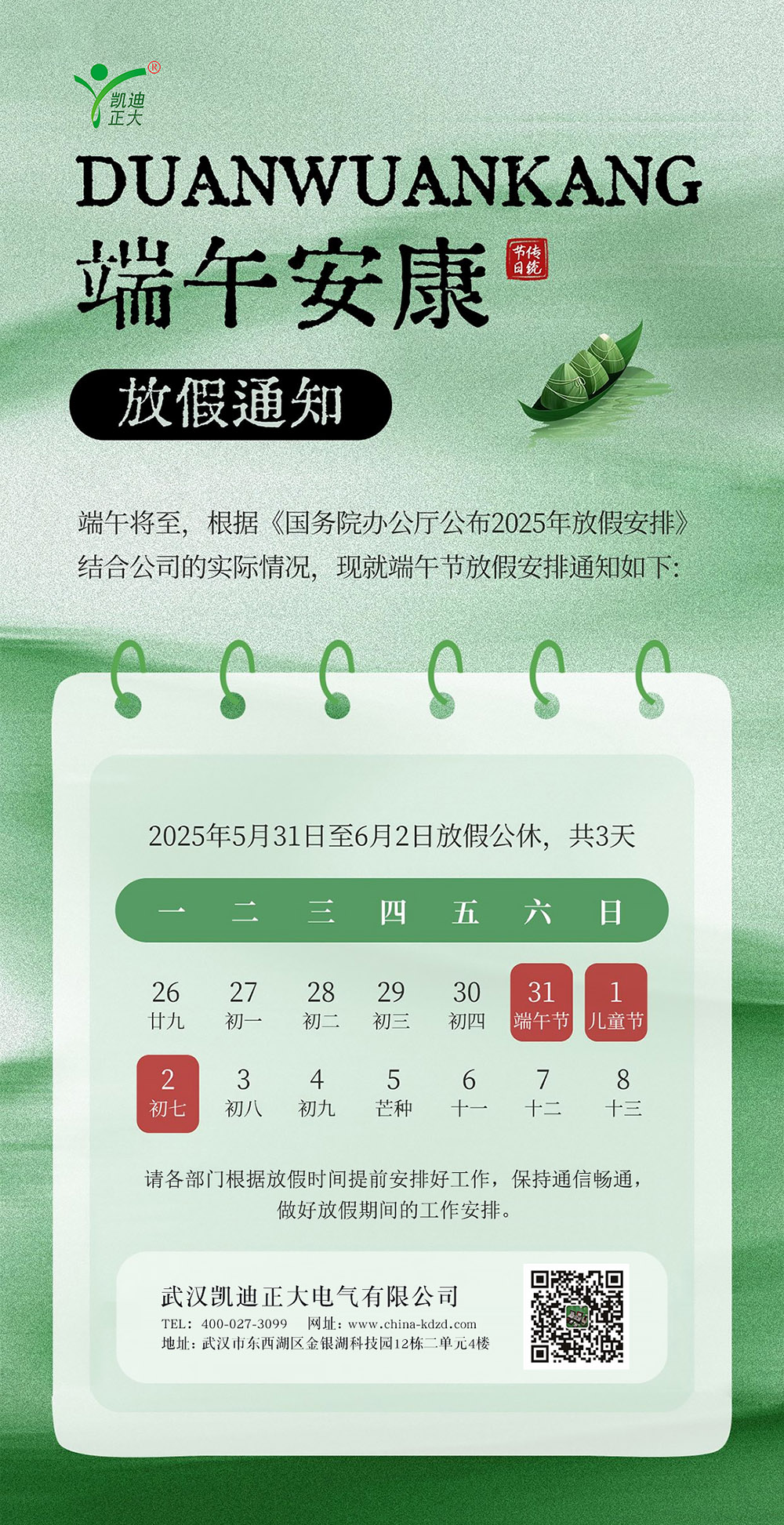 粽葉飄香時,龍舟競渡日,值此端午節來臨之際,根據國家法定假日安排及公司實際情況,現將武漢凱迪正大電氣端午節放假安排及相關工作要求通知如下: