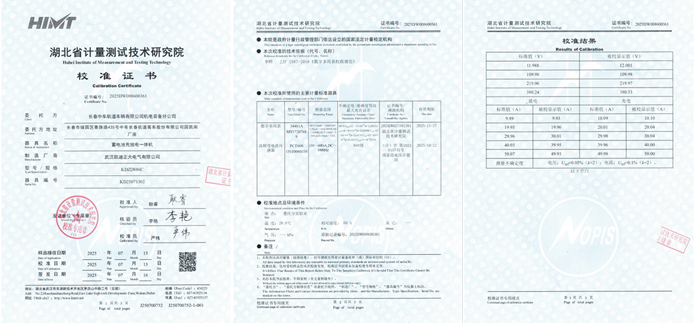 2025年7月16日,湖北省計量測試技術研究院正式簽發了編號為2025DW008600361的校準證書,完成了對武漢凱迪正大電氣有限公司研制生產的KDZD886C蓄電池充放電一體機的計量校準工作。