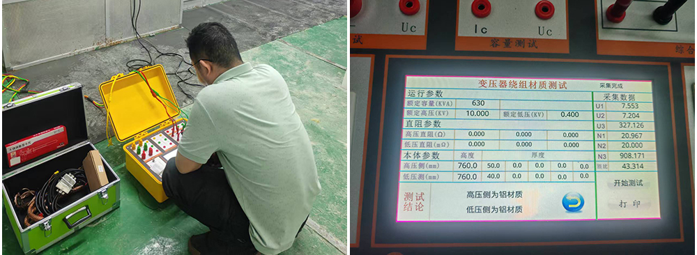 經KDBR-CZ配電變壓器銅鋁材質判別測試儀檢測,干式電力變壓器(型號 SCB13-630/10:4)的高壓側為鋁材質,低壓側也為鋁材質。
