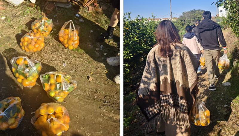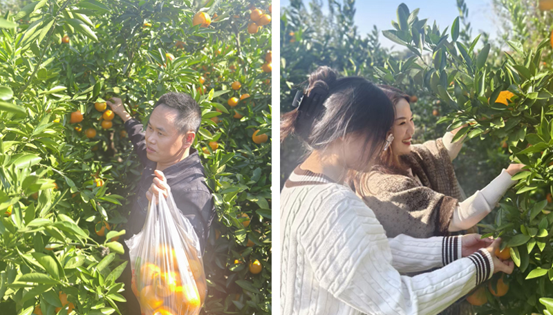 午餐的歡愉余韻未消,大家便迫不及待地提上果籃,奔向那片金色的海洋,真正的“探險”就此開始!步入橘林,漫山遍野的橘樹碩果累累,金黃的果子掛滿枝頭,清新的果香沁人心脾。同事們瞬間化身“探險家”,三五成群,穿梭于果樹之間。