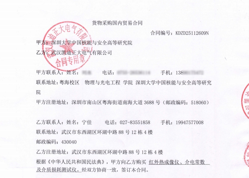 近日,深圳大學(xué)中國核能與安全高等研究院正式采購了武漢凱迪正大電氣有限公司的KDRX-2581紅外熱成像儀與KDYD-JZ介電常數(shù)及介質(zhì)損耗測試儀,合同編號KDZD25112609N。